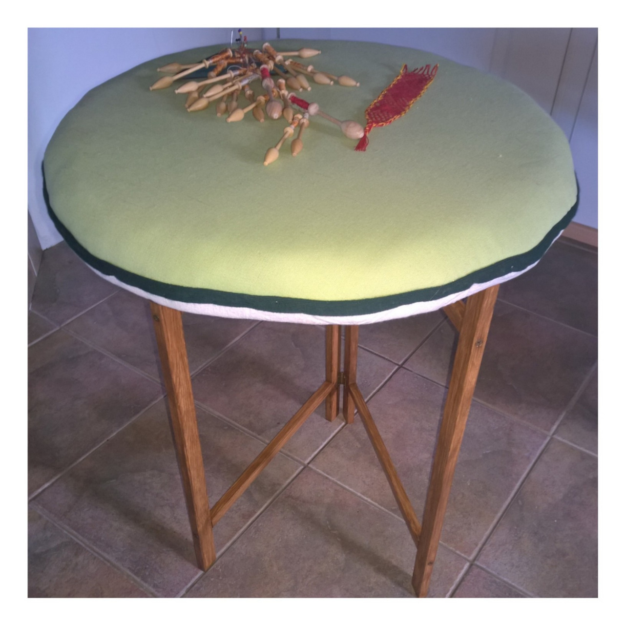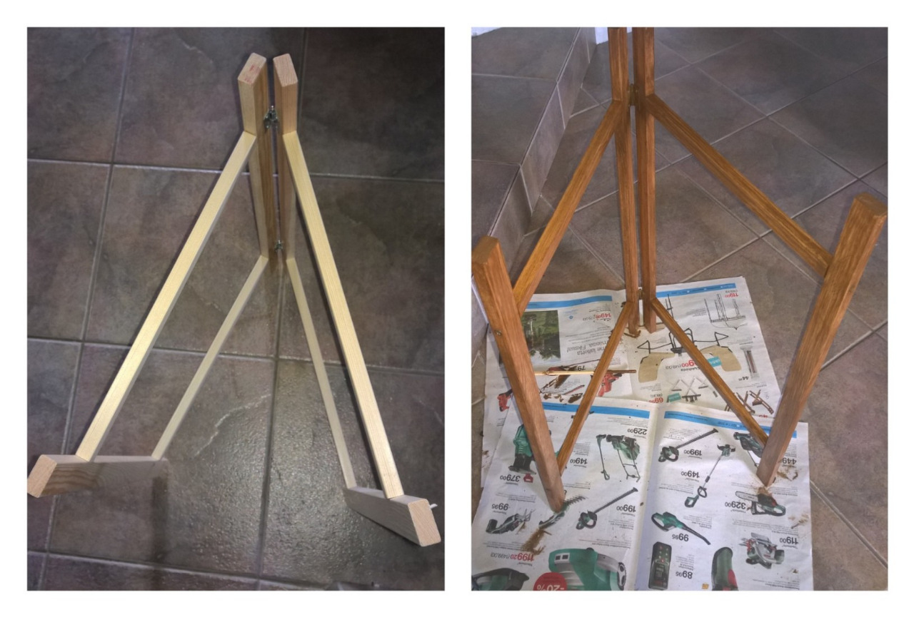Puutyöt.. ne on asia, joissa tarvitsen vielä harjoitusta. Mutta kun on visio ja tarve, niin pakko on yrittää. Nypläystyynyni (joka sekin itsetehty joskus aikaisemmin), kaipasi jalustaa. Sellaista kevyttä ja helposti siirrettävää, jopa kuljetettavaa, joka siis menee tarvittaessa myös pieneen tilaan. On kokoontaittuva. Hain höylättyä puutavaraa, pari saranaa ja öljyvahaa.