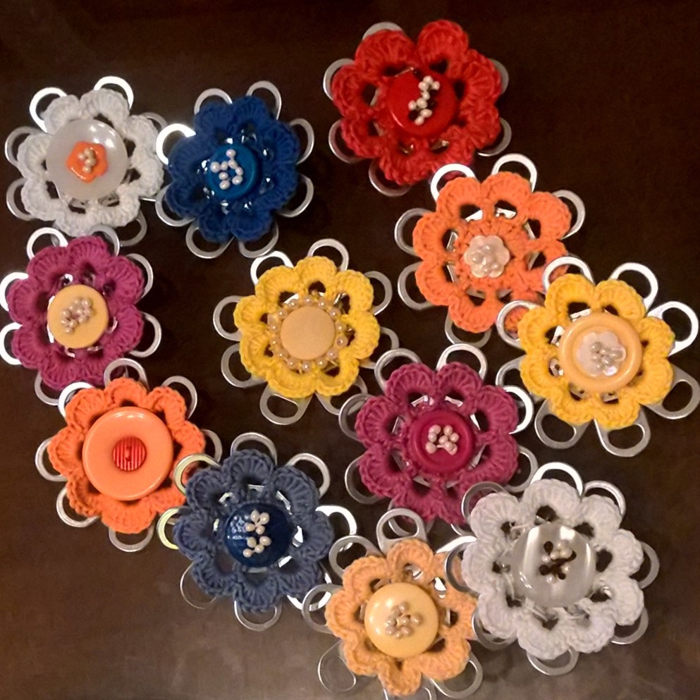 Sadetihkuisen päivän virkistykseksi aloin kehitellä tölkkiklipuista kevätkukkasia. Näillä voi koristella laukkua, jakun kaulusta, verhoja,... Mielikuvitushan näissä muodoissa on rajana. Tavoitteena on, että täsmälleen samanlaisia ei tule.