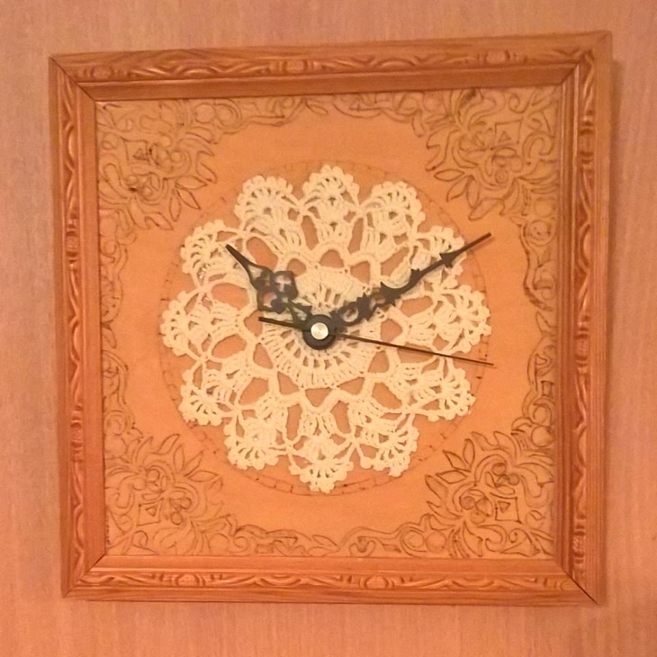 Sukupolvien yhteistyötä. Isoöitini on tehnyt tämän kellon puuosat ja koristukset yli 20 vuotta sitten. Ajan saatossa se on hiukan haalistunut, joten päätin kokeilla tuunausta. Virkkasin siihen uuden kellotaulun. Ja niin kello jälleen käy.