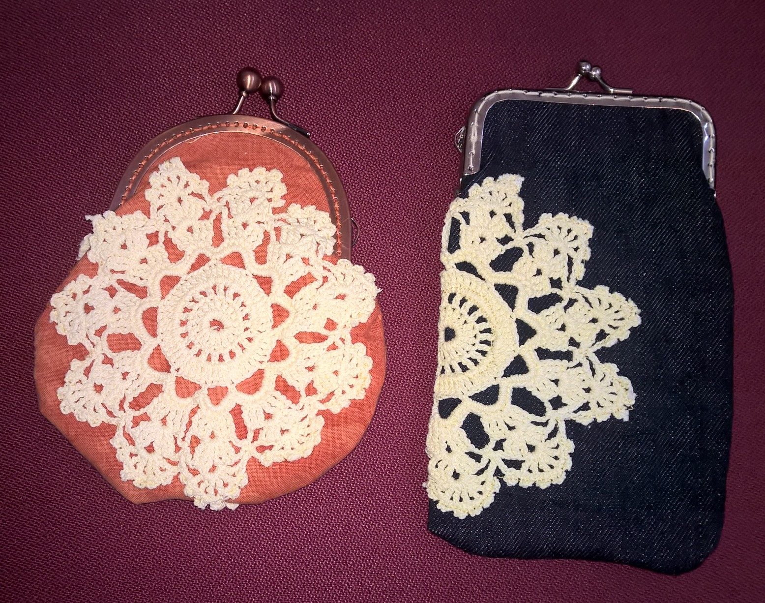 Samaa pitsiä, kaksi eri tyyliä. Ommeltavat kehykset on käteviä. Ja pussukoiden ompelussa ei turhia mutkia ole. Kun vielä silittäisi saumoja auki, saisi pedantimman näköistä jälkeä. Mutta käyttöön nämä on menossa, joten siinä sitten oikeavat.