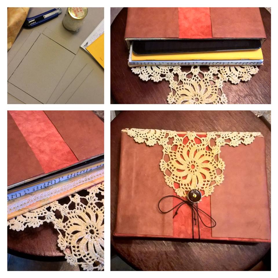 Jo pitemmän aikaa olen pähkinyt, miten saisin minipadin, kalenterin ja muistikirjan samaan suojaan. Nyt sen keksin. Kirjankansipahvista kotelo, jonka vuorasin kankaalla ja päällystin osittain nahkalla. Kalalankaista pitsiä vielä kanneksi, ja siinä se nyt olisi.