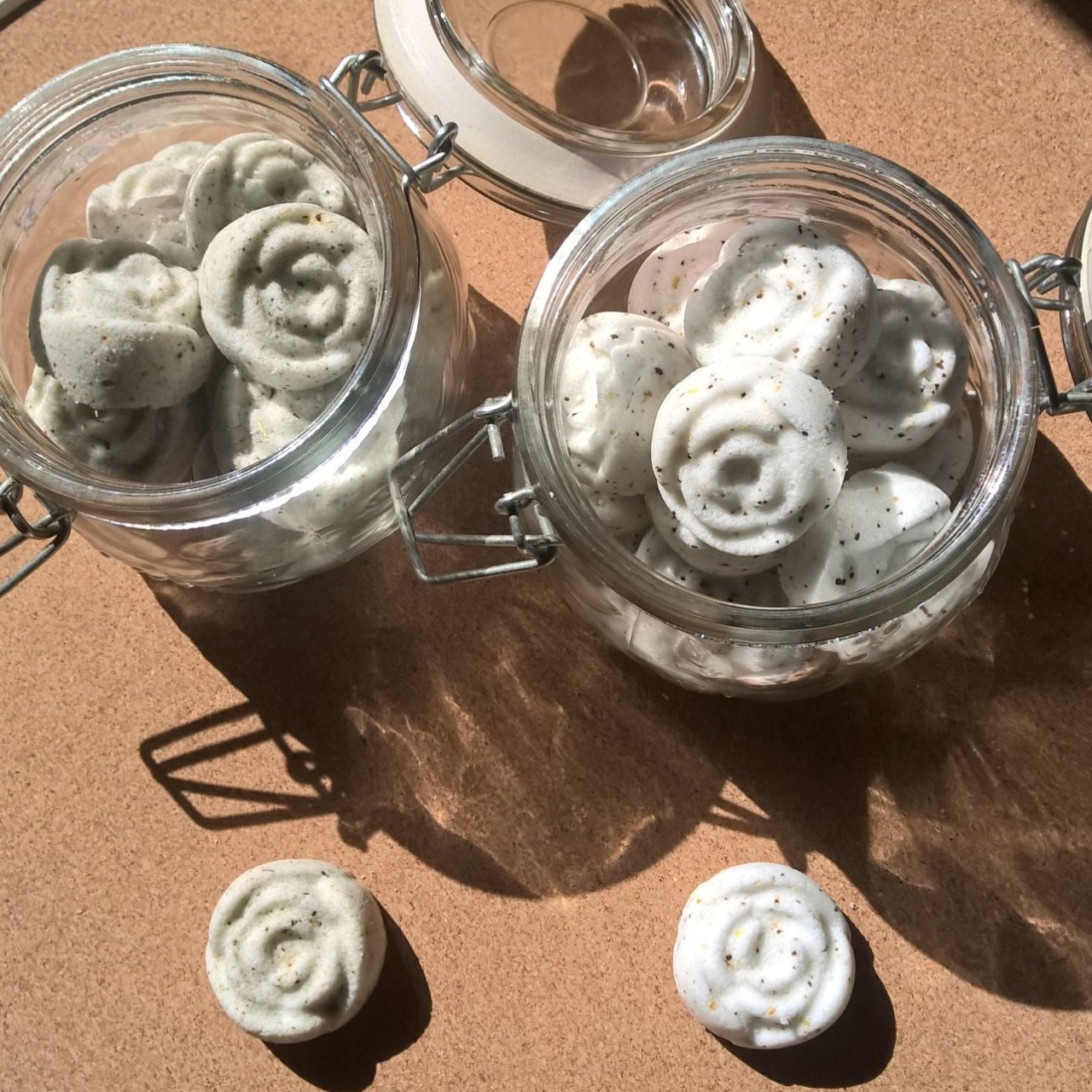 Soodaa, sitruunahappoa, pähkinäöljyä ja hiukan aromiyljyä ja yrttiteetä sekä hitunen vettä. Ja kappas, kylpyporekukkaset muotissa kuivuttuaan ovat valmiita käyttöön. Oih, ne toimi!