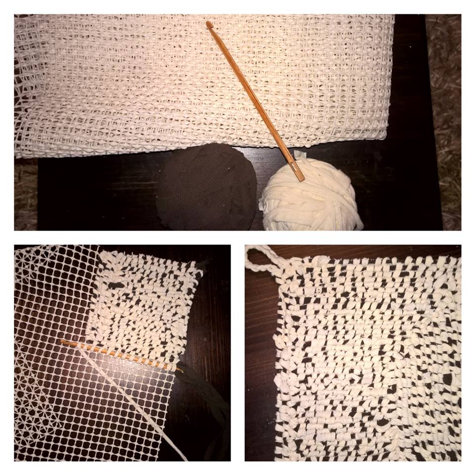 Pakko oli kokeilla. Pohja on maton alle laitettavaa liukuesteverkkoa ja kuteet vanhoista t-paidoista leikattua kaitaletta. Puinen koukku on nimeltään neulakoukku, koska virkkuukoukun lisäksi siinä on neulansilmä. Täytyy hiukan tekniikkaa vielä kehitellä, mutta eiköhän tällä muutama pannunalunen tule tehtyä ja kulahtaneet t-paidat saavat uuden mahdollisuuden.